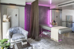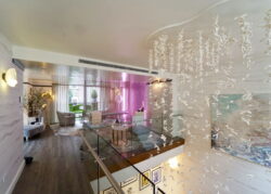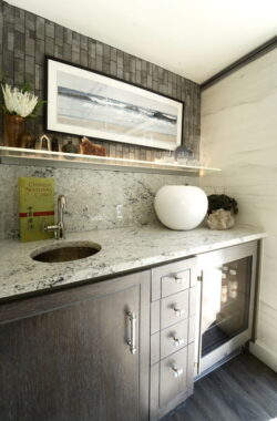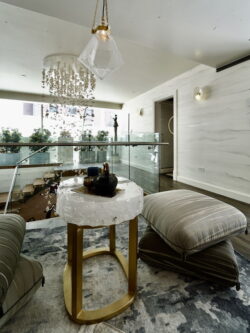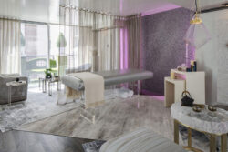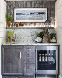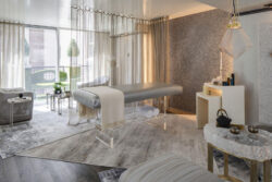 Executed in a subtle color palette of pale grays, and subtle hues, the furnishings scheme is intended to envelop the room and to be soothing on the eye to allow the components to subliminally nourish the human spirit. An abundance of natural crystal and a fine curation of art work bring deeper meaning, creating a sanctuary in a luxury residential home retreat.