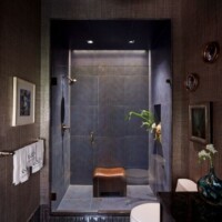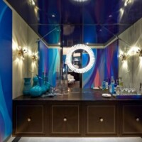 The adjoining Dry-Bar hinges around the commissioned paintings which take focus in the cut-glass mirrored wall. The wall is punctuated by an OLED convex decorative mirror, and a midnight-blue stretched PVC ceiling provides dazzling reflective quality and a sensual expansion to the tiny yet provocative space. The bathroom speaks masculinity with its chocolate glass and metallic grass-cloth walls and marble floor yet repeats the strong vein of contrast and color with a dazzling blue shower niche and dramatic lighting in the typical Pavarini Style.