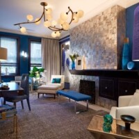 The rich chameleon walls feature a base coat of Lapis Blue and top coats of aqua mixed with eye-shadow and finished in strié, resulting in an ever-changing wall finish that varies in effect as it absorbs and reflects light. Rich espresso custom architectural millwork and custom asymmetrical floating cabinetry and shelving accented in stainless-steel marquetry and starburst veneer patterns anchor the complex design scheme. A delicate balance of deep wood finishes and custom millwork, patterned leather, lush carpeting, and a curation of hand-crafted pieces of lighting and furniture, the scheme embodies the synergy of the Pavarini Design philosophy hinging on drama through restraint.